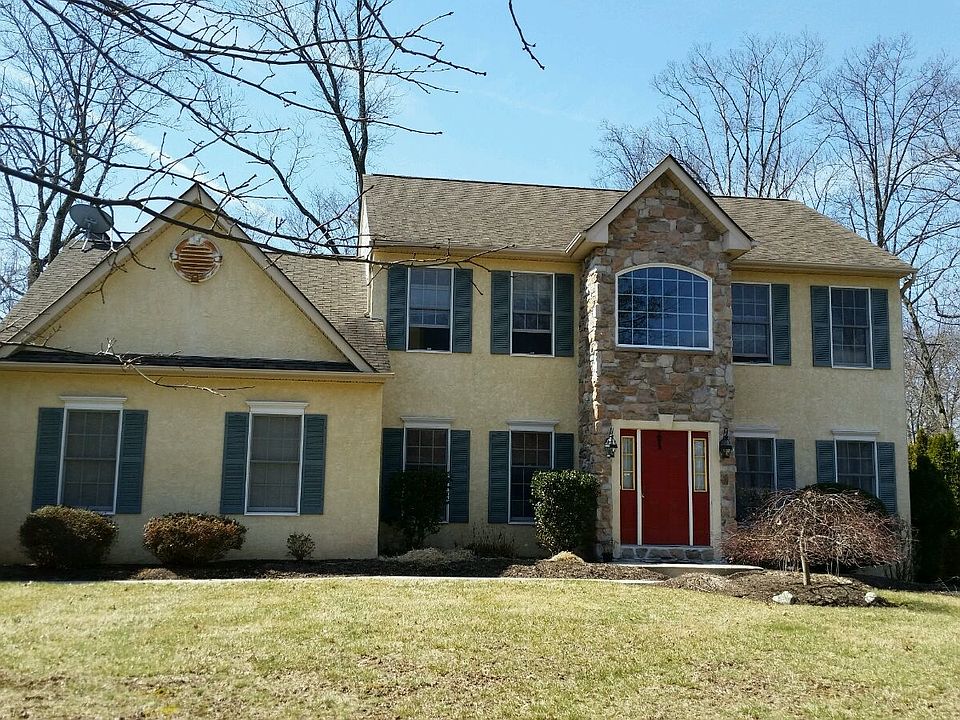 Come see this beauty nestled in a Community setting on a established homesite while convenient to everything! Schools, Shopping, Downtown District, Parks, Walking Trails, Septa R-5 servicing Philadelphia and Doylestown and easy access to major highways and interstates. This 2-Story Center Hall Colonial is situated on a half Acre home site offering expert plantings and a setting of matured trees. The formal Entry Foyer offers a warm grand greeting with rich hardwood flooring plus a Palladian window provides a blanket of natural sunlight. The archway off of the Foyer to the open and adjacent Formal Living and Dining rooms allows for formal entertainment, a gathering place for special occasions and celebrations, or intimate candlelit dining! The first floor Den/Study is away from the hustle and bustle of the first floor living areas and is a perfect place to act as a nerve center. The leisure living area is positioned to the rear of the first floor and provides an open great room feeling with the connection of the gourmet Kitchen, Dining Area, and Fam Room. The Gourmet kitchen is complemented by a center island breakfast bar that is idyllic for the morning cup of coffee or quick meals on the go! The Gourmet Kitchen is complete with custom cabinets, plenty of gleaming granite countertop space, stainless steel appliances and a pantry storage closet. The Fam Room is a great room to lay back, relax and cozy up to the warmth of the floor to ceiling stone fireplace. The vaulted ceiling and skylights with natural light add to the comfort. French doors lead to the rear patio of outdoor living. Sit back, relax, entertain, or enjoy a back yard barbecue in the tranquility of a secluded setting. On the second level you will find a Master/Owners Suite offering a sweet retreat complete with a sitting room to escape to peace and quiet. Also find a large WIC and Master/Owners Bath offering the convenience of a double bowel vanity, CT stall shower and platform soaking tub for those tired muscles. Three additional Bedrooms finish this level all with double door closet space, w/w carpet and CT tubbed hall bath with vanity. Escape to the Full finished lower level that expands the living area! This is a great get-a-way for casual entertainment, game tables, hobbies, exercise equipment or whatever your desire. This space is complimented with Pergo flooring and hi hat lighting! Note: Master Bedroom, Back Patio and Den pictures reflect some virtual staging.