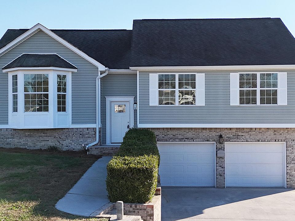 This modern split-level home sits in a quiet cul-de-sac on 2.08 acres. All carpet, hardwood, granite countertops, light fixtures, faucets, the deck, and all kitchen appliances are brand new. With 3 bedrooms, 2 baths, and 2,084 sq ft, it offers comfortable, easy living. The living room features cathedral ceilings, a bay window, and a gas fireplace, opening to the dining area with the kitchen just beyond. The kitchen includes granite counters, wood cabinets, a tile backsplash, and a breakfast bar. The primary suite has a double tray ceiling, bright windows, and soft carpet, plus a bathroom with double vanities, a walk-in shower, and a jacuzzi tub. Two additional bedrooms share a full bath. A spacious downstairs bonus room provides flexible space for a den, media room, or play area. A two-car garage offers convenient parking and storage. Enjoy the sunny back deck and the cleared, gently sloping yard. This property offers space, privacy, and modern comfort in a peaceful setting.
