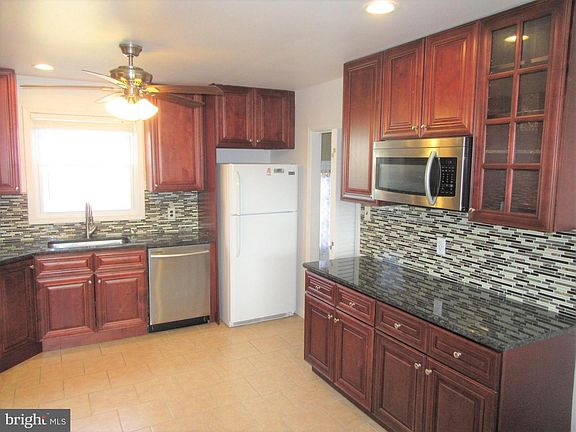 4BR/2.5BA colonial with updated kitchen and one car garage. Kitchen with 42 in. cherry cabinets, granite counter tops, tile backsplash, and tile floor. Built-in dishwasher and microwave, 5-burner gas range, and ceiling fan. Adjoining Dining Room with decorative wainscot molding and ceiling fan. Formal Living Room with large picture window. First floor Bedroom. Half bath on main level. Many rooms have oak hardwoods (incl. the LR, DR, and first floor BR). Main level Laundry /Mud Room with access to patio and fenced backyard. Main Bedroom upstairs shares an updated Hall Bath with 3 other Bedrooms (one is currently used as a home office). All bedrooms have ceiling fans. Family Room in finished basement with Bar area and updated full bath. Still some unfinished area for storage. The application process includes credit, employment, background, and reference checks.The application process includes credit, background, employment and reference checks as well as proof of income/assets. Please view these BEFORE requesting a showing via email. No pets.