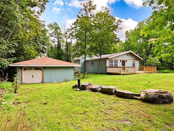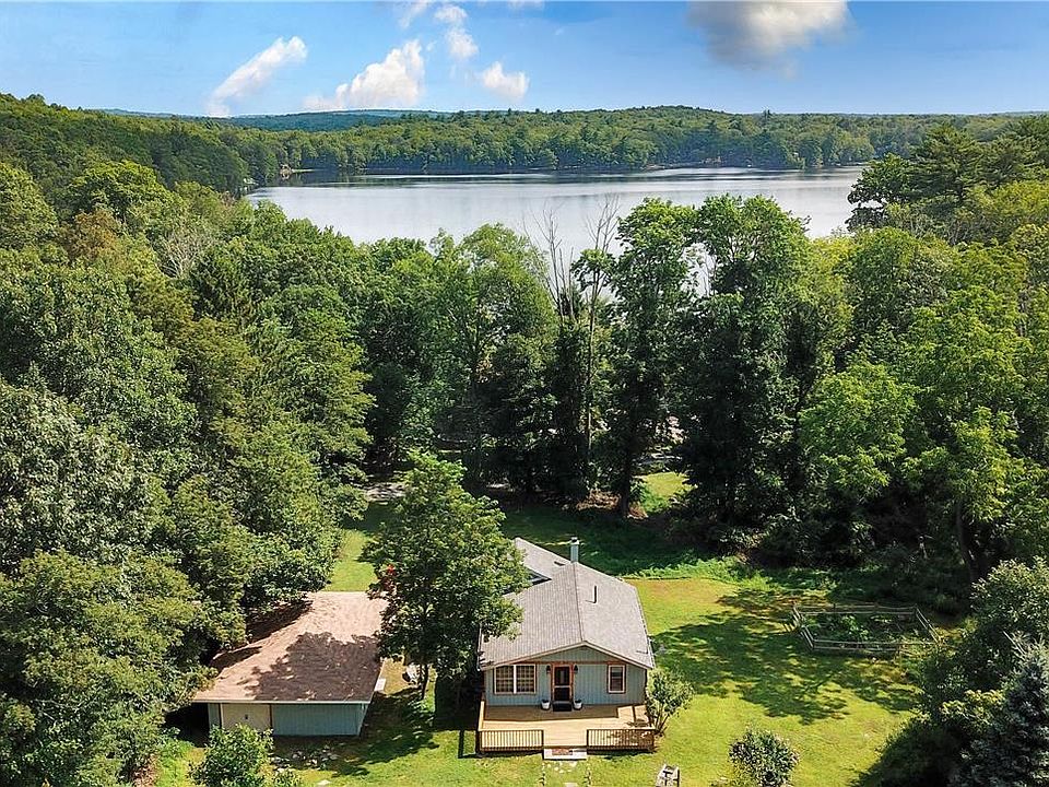 Beautifully RENOVATED ranch home with a LAKEVIEW and walking distance to community lake. Open Concept great room with cathedral ceilings and bonus den. NEW flooring, NEW modern light fixtures, NEW kitchen, warm wood counters, STAINLESS steel appliances, and modern, luxurious bathroom with tiled shower. 2 bedrooms in main house, plus additional detached building with finished lounge area, bonus room/bedroom and 1 car garage. THREE LOTS for a total of over 1/2 acre with large open backyard on a corner lot with NEW decks and firepit. NEW well and NEW Roofs on both buildings. Low Dues community with beach, playground, basketball courts, kayaking and fishing. Ask how to receive a $2,000 lender CREDIT towards closing costs or lowering your interest rate!