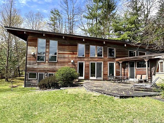Welcome to an architectural wonder sitting on 1.73 acres of secluded and private land in the heart of the Village of Woodstock. This magnificent Woodstock Contemporary is a combination of the modern, clean lines of a Frank Lloyd Wright inspired design added in 2003 and a Buckminster Fuller style geodesic dome built in 1970. Offering over 3,000 square feet of living space as well as a magical Central Park gazebo and stone patio, the home was designed as a work of art as well as a place to call home. With beauty and open space indoors as well as a feeling of warmth and intimacy, the home is a wonderful retreat for family and friends. The hand carved, mahogany front door leads to a stunning, open living space filled with light from glass doors and windows high at the pitch of the Douglas Fir vaulted ceilings. The living space also has a gas stove that adds to the warmth. The lofted, galley office leads to the primary suite that is filled with light and warmth from a beautiful bedside gas stove. The primary bathroom has two sinks, an extra-large shower and steam room, and a walk in closet reminiscent of that in a SoHo loft. Downstairs there is an additional entrance through a large mudroom that leads to a hallway with laundry and additional storage. There are guest bedrooms downstairs as well, both with private full bathrooms and doors leading to the patio where guests can sit with the fine work of local artist Tom Gottslaben. The dome is a conversation piece in and of itself. Built in 1970, it is no doubt a part of Woodstock history. It has its own private entrance and full bathroom as well as an open, modern kitchen. There is a wood burning stove off the center and it can be configured as multiple spaces including dining, living, and screening area. Just minutes to some of the highest rated restaurants in Upstate New York as well as world famous music venues and the best outdoor entertainment, this is a once in a lifetime opportunity to own a piece of history in the most sought after part of the Hudson Valley. Please visit our OPEN HOUSE Sunday, May 7th between 11am-1pm.