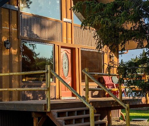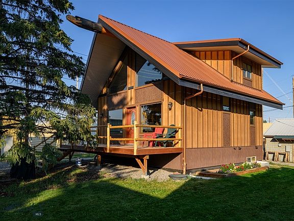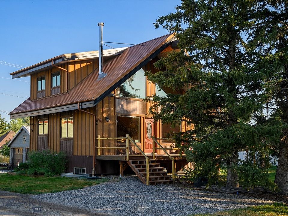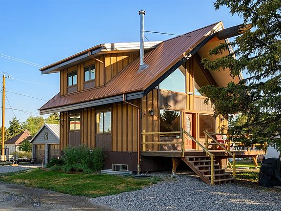 Gorgeous custom home in the heart of Manhattan! Perfectly maintained home with lots of extras. Wood and metal soffits and accents with a metal roof. Hand carved art above the front door and a covered front deck. Gorgeous wood finishes throughout. 3 bedrooms, 3 bathrooms, including a master bath with a double shower and separate soaking tub. Forced air heat, and plumbed for air conditioning, with a wood stove that can be used as a back-up, or for ambiance. It can also be used to provide heat for most of the home to reduce your bills! There are 2, 500-gallon rainwater tanks underground (attached to gutters) mainly used for watering the 6, 80-foot spruce trees that provide shade and privacy. Raised beds for gardening. High quality and thoughtful finishes throughout. A must see! Owner will consider trade for 20-80 acres in the mountains with live running water. Call agent for details.