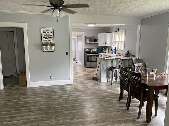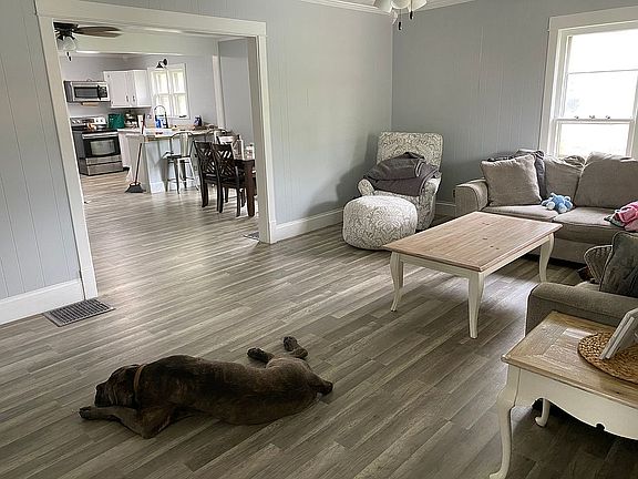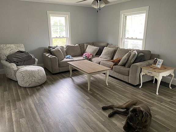 Adorable home in Clinton Prairie district with so much curb appeal! Covered front porch with a cement walk way. Inside has been completely updated with new flooring, crown molding, new kitchen and Mayer bath. New windows 2021. Complete around the house. Fenced yard. Nice large shed and garage in the rear. There is a sunroom with glass surround screen. Large living and dining rooms. 3 bedrooms (one with private 1/2 bath) with nice sized closets. Small town living - close to the store