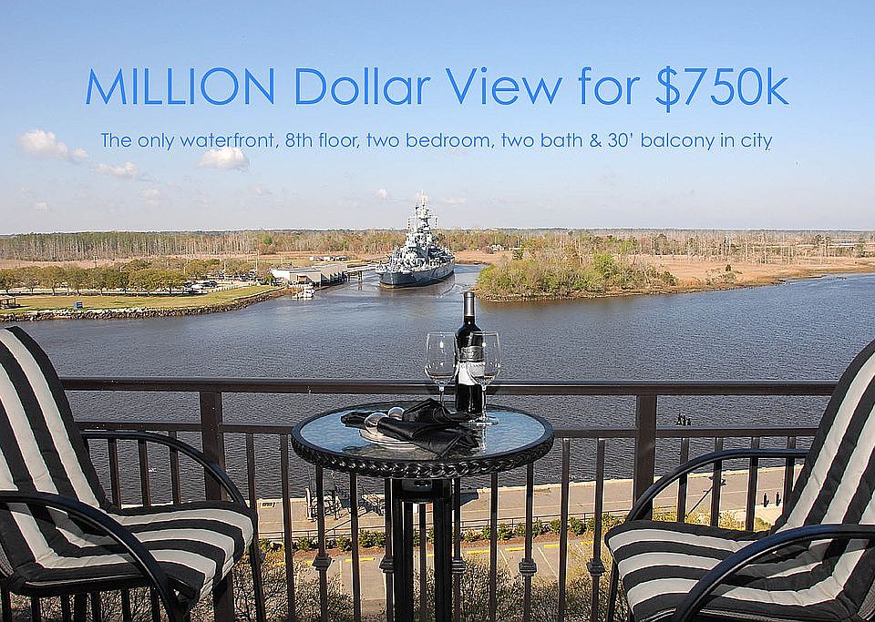 $600k double condo & verandas (182 sf, 30+ linear feet total) are 8+ stories above the river with sweeping 7 mile views. In 2007 suite 809, a $300k condo, was mated to Suite 810, the two retitled as one large condo, offering the largest privacy veranda. City views on its rear gallery entry side are unmatched. The 2 bed 2 bath condo master bedroom has a walk in closet, en suite bath, tall mirrored abundant storage, both city and river views. Beneath the guest bath vanity are a washer & dryer. Kitchen appliances are behind cabinet doors for a clean sleek look. One way glass allows privacy from outside view. The 1,182 sf condo plus the 2 verandas total a combined covered space of 1,364 sf. 2 car free parking.