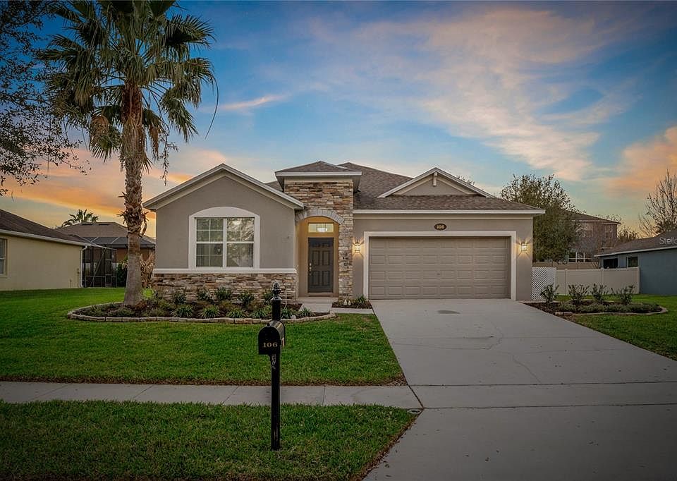 Have you been wishing the perfect home in an established, exceptional neighborhood would come available? Your dreams have just come true! To visit this home is to fall in love with every meticulously-maintained detail. Strolling by the landscape-lined front walkway into the welcoming entryway reveals a vaulted ceiling and beautiful wood-laminate flooring throughout the main living areas. The open floor plan allows for life to ebb and flow freely between the Living Room, Dining Room, Kitchen and Dinette. The exceptional Kitchen offers a delicious combination of plentiful cabinets with crown molding, stainless appliances, tile backsplash, a large granite-topped island with three bright pendant lights illuminating a breakfast bar as well as a closet pantry. The Master Suite offers not only a large bedroom with his and her closets and one-year-young carpet, but also a spacious en suite bath with double sinks, granite countertop, glass-enclosed shower, linen closet and water closet. Bedrooms 2 and 3 with newer carpet (2020) are located on the opposite side of the home separated by a guest bath with a tub/shower combination. Triple sliders open to the screened lanai which overlooks the large back yard. Two overhead storage racks in the garage convey. Hot Water Heater replaced 2022. Irrigation system updated in 2022. Feel like you're on vacation all year long enjoying the large community pool, cabana, shallow kiddie pool, basketball court, playground, 34 acre tortoise preserve with walking trails and beautifully-landscaped common areas. All this, and nestled only a few miles from I-4 in between Tampa and Orlando. Come see all that this home and community has to offer your family today!