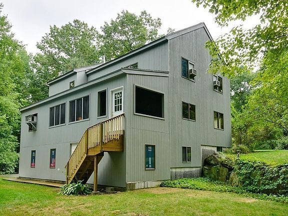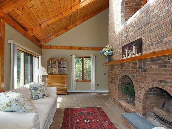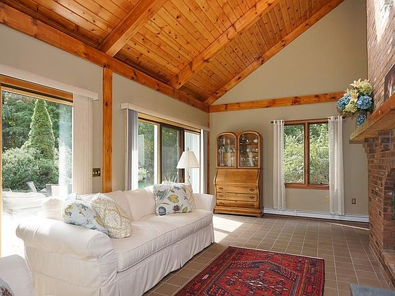 Depart from the norm with this dramatic contemporary south sited nestled on cul de sac with gardening open lot fringed by woods and privacy plus an above ground pool. This unique home has been freshly painted with perennial gardens and offering a 3 car garage. Enter the tiled airlock and enjoy the post and beam construction with sunny tiled living room dominated by massive floor to ceiling fireplace with sliders to the deck, large family room with access to screen porch, large tiled kitchen with granite counters, pantry, and eating area adjacent the large dining room warmed by wide pine floors .Conveniently located on this level is the powder room and laundry The cathedral ceiling master offers large bath with Jacuzzi and shower, and a walk-in closet. The two other bedrooms share a bath while one bedroom has a great loft. The large screen porch overlooks the large back yard while the south facing front deck extends outdoor living.
