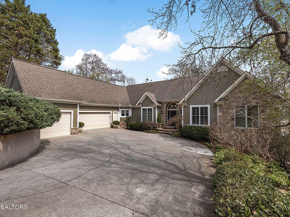 Enjoy beautiful East Tennessee water views from this elegant and refined waterside home. Oversized windows and French doors allow views of the water from almost every room and the addition of rich hardwoods and moldings add a beautiful touch. From the spacious foyer, guests and family are welcomed into living space that is open and seamless. The main living space offers ample room for seating venues along with a focal fireplace and flows effortlessly into a formal dining room where dinners and celebrations can be had with room for everyone. The open kitchen and additional living space offers a more intimate place to gather for cozy nights in. The eat-in kitchen with stainless appliances, island, gas cooktop, and double ovens also boasts a walk-in pantry and butler's pantry which offer plenty of cabinet storage space. Directly off of the kitchen and den is a gorgeous screened in porch with a vaulted ceiling with wooden beams and water views. The primary suite is spacious enough for seating and allows access to your private back deck. The attached bath boasts dual vanities, walk-in shower, and jetted tub. A home office with a built-in desk and cabinetry complete the main level of this home. The lower level of the home has a spacious entertaining space with a fireplace and room for seating and gaming tables. The remaining three bedrooms and two full baths complete this home. Days and nights can be enjoyed not only on the screened porch but also from the covered and uncovered decking that expands the width of this home as well as the stone patio that rests closer to the water.