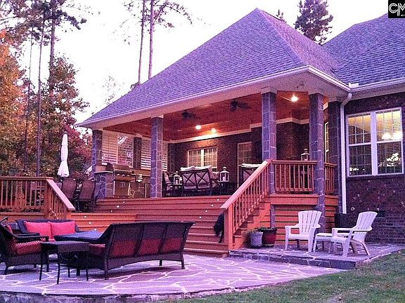 Exceptional custom features found in this all brick home with Master Suite and 2nd Bedroom on main level. Fantastic outdoor living (awesome porch with full outdoor kitchen overlooks stone patio with built in firepit and huge privacy fenced backyard)! Lovely 2 story foyer w/Formal Dining Room and Living Room on each side; Family Room (w/vaulted ceiling and fireplace) opens to Kitchen/Breakfast area with granite counters, stainless appliances, island and gorgeous cabinetry. Master suite offers large walk-in closet, Master Bath with double vanities, whirlpool tub and separate shower. 2nd Bedroom on 1st floor great for guests or a small child. 2 or 3 additional Bedrooms (FROG w/closet) upstairs, double vanity Bath, PLUS a separate Workout/Exercise Room! Archideck built Porch (featured in their advertising) w/high tongue and groove wood ceiling, custom stainless and granite cooking area, beverage fridge and icemaker. Opens to deck and stone patio with large firepit! Too many custom features to mention. Great neighborhood w/pool and convenient to I77, downtown Columbia and Ft. Jackson.