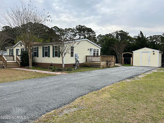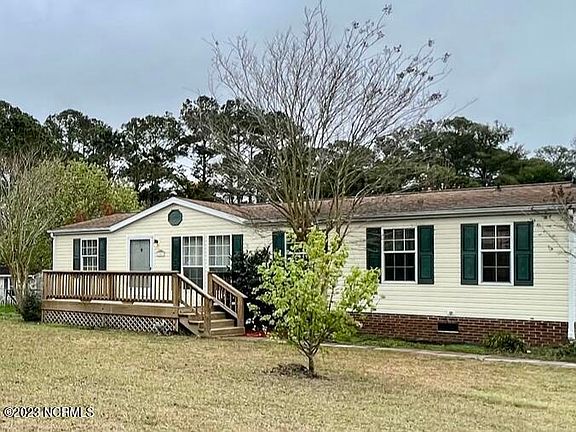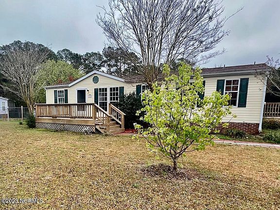 Location! Location! Location! This 3 bed 2 bath home is centrally located between Camp Lejeune and Cherry Point. Home is within minutes to local attractions, Emerald Isle, and historic downtown Swansboro. The location makes this home a great primary residence, vacation home or investment. South Winds Estates has NO HOA. This home is over 1600 sq. ft and has an Open Floor plan, Large 16 x 20 Florida Room, Sheet Rock walls, outside Gutters, Puronics water filtration system and tons of storage space. Spacious Kitchen has plenty of cabinets and countertop space. Large Owner's Suite with garden tub and walk in shower. There are two sheds in the fenced in backyard, one with electricity and can be used as a workshop. The large yard has mature landscaping which you can enjoy from one of the three decks. Seller is offering 1500 allowance for carpet with full price offer. Be sure to check out the virtual tour and floor plan.