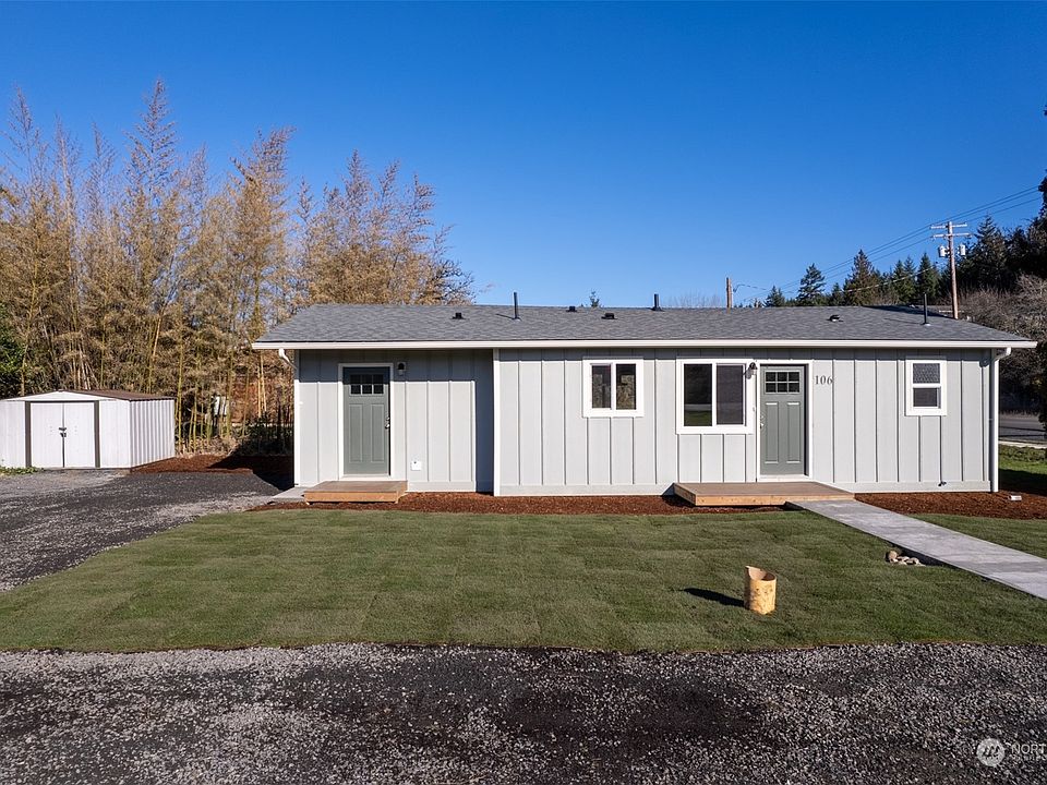 Newly remodeled home done right. From curb appeal to comfort you will love this one! This single level home has just gone through a remodel of a lifetime and now ready for a new buyer to reap all the advantages. Outside, offers large parking with metal shed, new board and bat siding--new vinyl windows--new 30 year composition roof--New sewer/waterlines from city to home--new insulation in walls/floor/attic--all new electrical throughout including connection from city, panel, plugs, switches and more. Home offers open concept with vinyl flooring, white shaker kitchen cabinets, SS/appliances. Large utility room w/separate entry-- Double sink bath vanity with fresh interior/exterior paint--with a ductless heating system. A must see!