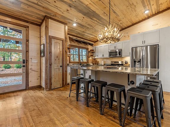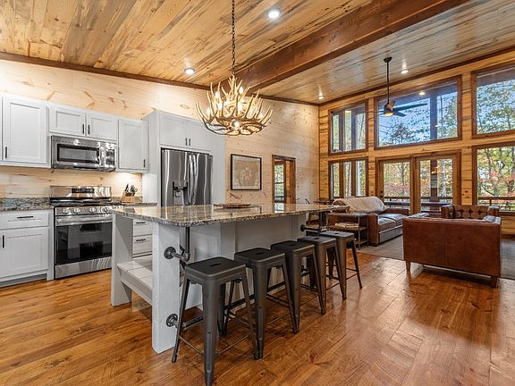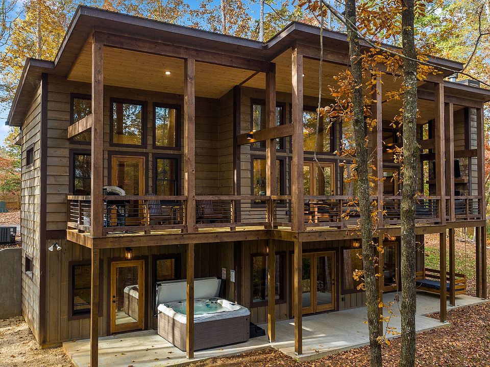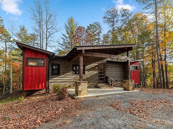 Red Bird, Take Me Home! -- situated within lush forestry and less than seven minutes to Downtown Blue Ridge, this contemporary rustic chalet makes for the perfect retreat! Complete with two levels of open-concept living, stacked stone fireplaces inside and out, large outdoor fire pit, jacuzzi spa area, luxury king suites, and comfortable queen bunk room! The space is the perfect blend of modern and rustic w/ bountiful natural light and walls of glass in every room. Main level is complete with large kitchen and eat-in island, comfortable living room w/ luxurious furnishings and stacked stone gas burning fireplace, french doors leading to large deck and custom farm table, outdoor living room and additional wood burning fireplace. Find two large king suites on the main level w/ their own walk-in closets, tile showers, and dual vanities. On the terrace level, home is complete w/ large den space and fireplace, wet bar, game table, walk-out terrace deck w/ swing bed, spa jacuzzi and fire pit! Find an additional large king suite w/ tile shower and an additional comfortable bunk room complete with four queen bunks, walk-in closet and ensuite bathroom. Sold TURN-KEY and grossing over $100k in rental revenue!