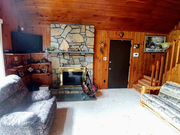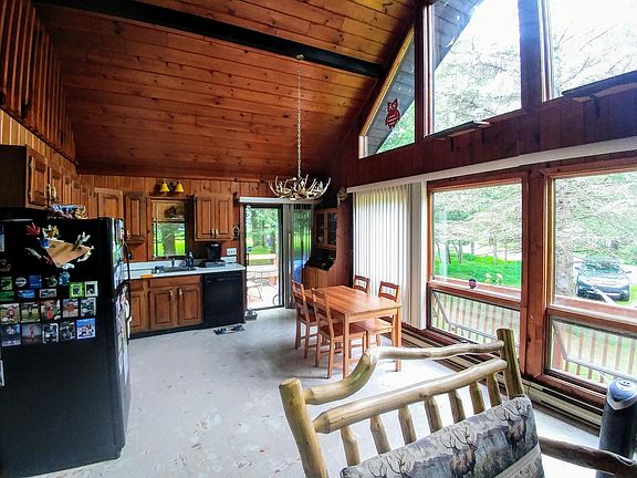 This is a true Pocono Mountain Chalet, With 3 bedrooms and 2 Baths. Large Loft with plenty of natural Light. Knotty Pine throughout. Basement is finished for a rec room or family room. Stone wood burning fireplace in the Living room. Deck across the whole front of this home. Storage shed included. Adjoining Lot is included in the sell of this home.