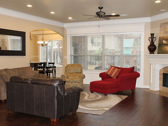 Incredible inviting home in desired neighborhood with walking trails and neighborhood park. The 8 ft tall mahogany front doors welcome you inside to high ceilings, crown molding, and large windows in the semi-open floor plan. The cozy fireplace can be gas or wood burning. Enjoy large kitchen with many cabinets, stainless steel appliances and nearby pantry. Covered patio provides great space for outdoor entertaining. The primary suite has a custom bathroom and a huge closet with built-ins. Safe room present.
