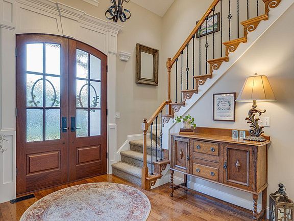 A stunning custom front door (local builder) sets the stage as you walk into this beautiful home. The main level boasts large windows throughout allowing for lots of natural light and views of the spectacular backyard and outdoor living space. If you like to entertain, this home offers the floor plan and space to do so in style! On the main level, your primary en-suite and a very large walk-in closet, dining room with picture frame molding, living room with 20' ceilings and large windows across the back, kitchen with custom built island with a gas cook-top, granite counter tops, under cabinet lighting and breakfast nook. A guest half bath, laundry with half bath, and garage (with custom built-in storage) completes the main level.