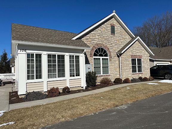 Get ready for the Good Life in this Sophisticated 1,922 sqft garden style condo at Stonybrook Village. This meticulously maintained Condo w/2 car attached garage is a rare find! Open concept unit w/cathedral ceilings throughout. Arched windows provide abundant natural light. Gas fireplace w/floor to ceiling stonework. 4-season Sunroom w/French doors and sliding windows will quickly become your favorite spot. Kitchen boasts granite countertops, breakfast bar, large pantry, SS appliances and travertine backsplash. The Primary bedroom with walk-in closet and double tray ceiling is equipped with en-suite bath with double vanities and walk-in shower. 2nd Bedroom has a large closet. 2nd full bath features granite countertops. Family Rm w/double french doors offers versatility as a home office/Ent. Rm. Laundry Rm w/included washer/dryer. You’ll also love to relax on your private patio. If you’re looking for a carefree lifestyle and the ease of 1st floor living, then this Condo is for you!