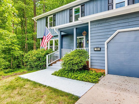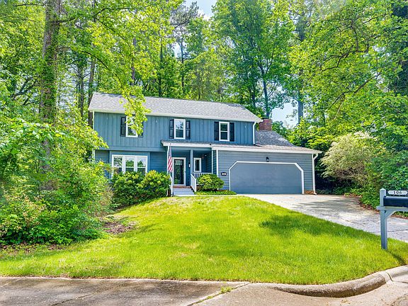 Beautiful 4 bedroom home on private wooded lot in the heart of Cary. Meticulously maintained, updated throughout. Quiet cul-de-sac location. Freshly painted in most of main level plus primary suite and garage. Gorgeous natural woodwork throughout this lovely home. Living room with large window seat overlooks pretty front yard. Enjoy the Franklin Stove for a cozy evening. Generous dining room with beautiful views out large bay window overlooking side yard. Kitchen has been remodeled with white cabinetry, pretty granite counters, large double sink, updated lighting and black SS appliances. Picture window at casual dining area with stunning backyard views. Family room with brick fireplace opens to large deck for entertainment and a beautiful wooded backyard that is entirely privacy fenced. Upstairs primary suite with fresh paint, remodeled master bathroom with walk in shower and walk in closet. Large unfinished attic space that could be easily converted to additional closet, office or nursery space. 3 guest bedrooms and hall bath plus a convenient laundry closet on this level also. Many updates include newer heat pump, tankless water heater, and newer roof. All windows have been replaced and all ductwork was replaced. No HOA! Don't wait, this well-loved home will not last! Interior Photos coming next week. Active status on 5-16.
