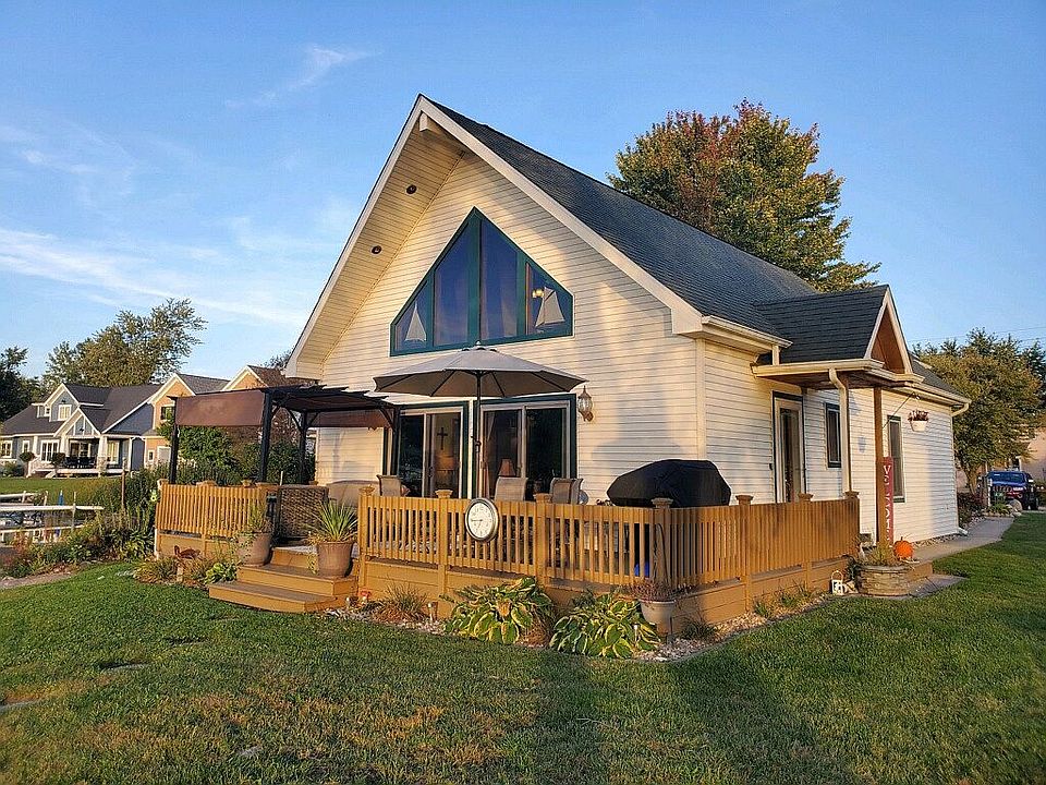 Clear Lake Meticulous Home! A very spacious home! 46 ft lakefront level lot! Every window has a lakeview! Stainless steel appliances! Thermador Stove, Bosch dishwasher and recently new refrigerator! Bar has a mini refrigerator to keep those deck drinks cold! Open concept for wonderful entertaining! Kitchen features an island and their is room for additional seating at a table! Recent upgrades- Added a 535 sq ft garage with additional bedroom above, relocated and purchased new grinder pump & tank, New Anderson double sliders on lakefront, concrete driveway to the road, landscaped, new kitchen countertops & sink, new flooring throughout first floor, fireplace & mantel renovated, all three bathrooms updated, new water heater, new sump pump & all interior completely repainted! This home is move in ready, on a level lot, and boasts the best sunset views!