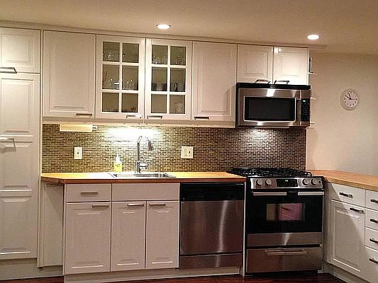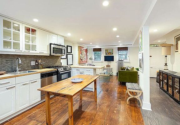 Huge 1 bedroom combines chic renovations with the charm of exposed brick, refinished wood floors and planted & paved garden. Entered from a private understoop to a wide living room. There is an entry nook with hooks and space for storage. Living room has two windows toward front garden a painted brick deco fireplace and is open to the kitchen. The eat-in kitchen is clean in design with white cabinetry, stainless steel appliances including dishwasher and microwave and butcher block countertops + bar seating. Opposite the kitchen is a large home office area built in shelving and desk. The bedroom is queen size and bright with two tall windows. An oversized bathroom has pedestal sink, deep tub and hall to laundry room. Access to the garden includes a private paved yard with stone deco hearth. As well as a huge shared deck with shade and manicured lawn. Prime Fort Greene location is a few blocks to Fort Greene Park, Pratt Sculpture Gardens, tons of boutique shopping and trendy dining include Walters, Romans, Olea and Cardiff Giant. Transportation line G at Clinton Washington, various buses and by car just minutes to Manhattan. CATS & Dogs on approval