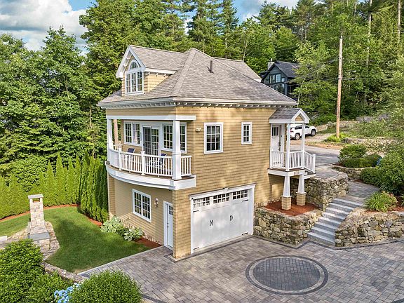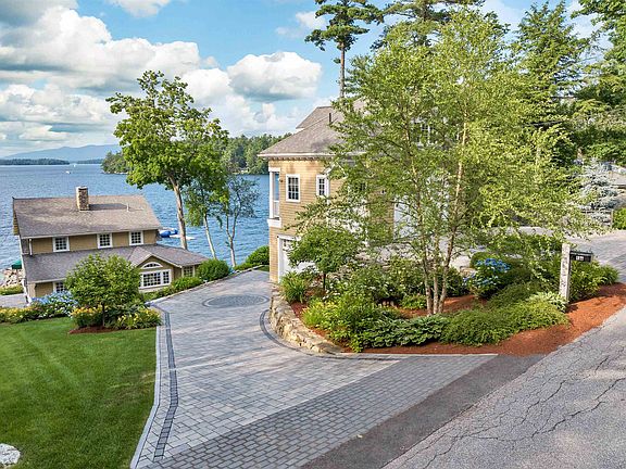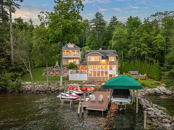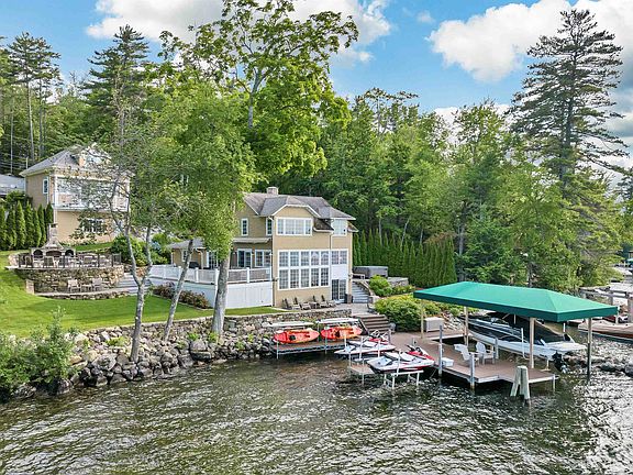 Experience the epitome of lakefront living with this stunning 4+ bedroom waterfront home on Lake Winnipesaukee with the most spectacular lake/ mountain views as well as gorgeous sunsets. The main house features a gourmet kitchen equipped with high end appliances, elegant granite countertops, a wet bar and built-n bench seat. Enjoy meals in the separate dining area or out on the large deck. Relax in the living room with stone fireplace & breathtaking panoramic views of the Big Lake. The upper level includes a luxurious primary bedroom suite with bathroom and walk-in closet, two additional bedrooms, & 3/4 bath. The finished lower level offers walk-out access to the water, plus an additional bathroom, laundry area, & ample storage space. The carriage house offers a private space with kitchenette and sleeping space for 8+ guests, two bathrooms, a media room & also boasts views of the water. Step outside to your many private patios & picturesque surroundings complete with incredible custom landscaping, granite steps & stonewalls. Walk along stone pathways, past your gardens leading to an outdoor fireplace and private hot tub area. The waterfront features deep water docking, a covered boat lift, steps leading into the crystal clear swimming area, & a protective breakwater. Your family and friends will love staying at this lovely waterfront paradise. This premier Gilford location is close to restaurants, shopping, a world class concert facility, & so much more.