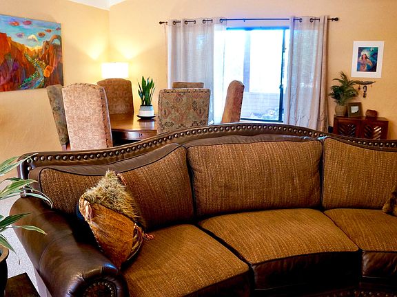 A simple yet spacious 4 bedroom 4.5 bath, ranch-style homesite located in the peaceful and quiet Chapel neighborhood with views of red rocks in the front yard and back. Each bedroom is rather large with its ensuite bathroom and own sliding door leading to the outside patios. The main feature right off the master bedroom is the built-in spa room with live plant walls and redwood planking creating a sauna-like aroma, 180-degree windows overlooking the tranquil, zen-like, huge backyard with dry creek bed, bridges, and entertaining gazebo. Recent updates include a new roof heat pump & A/C unit as well as high-end spa equipment that can be used as a hot tub or turned cold plunge in the summer. The in-law suite has its own private front entrance and back patio with en-suite bathroom, in addition to brand new flooring and a stunning view of majestic Cathedral Rock! The entryway and living room are open – featuring a log fireplace, berber carpet in great condition, vaulted tongue and groove planking and beams, windows and large sliding door to the covered Saltillo tile patio area. The kitchen was recently updated with brand new stainless steel appliances and is ready for easy remodel to create your personalized kitchen to your tastes! All bathrooms have recently undergone full remodels, all in matching slate tile. This house has been both an amazing and comfortable place to call home as well as many configurations including short or long-term tenants in the in-law suite, as well as a very successful 6-figure short-term rental property. Short term rentals are allowed and valuable enough to considerably offset the cost of ownership. Property is elegantly appointed/furnished and turn-key ready including all linens for short-term rentals for the perfect buyer!
