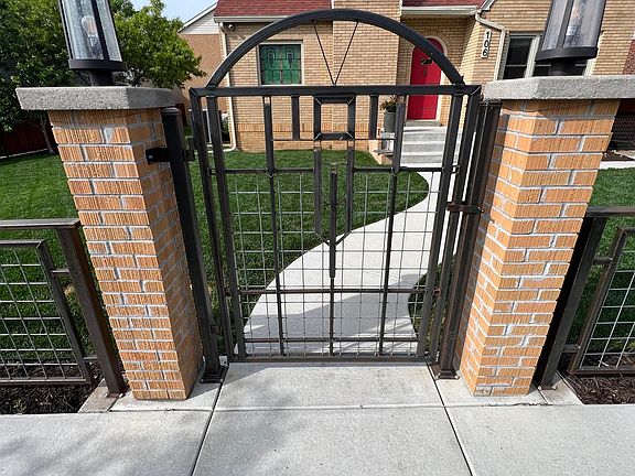 Established treesStriking new buildingBrick exteriorCustom welded fenceOne car detached garage