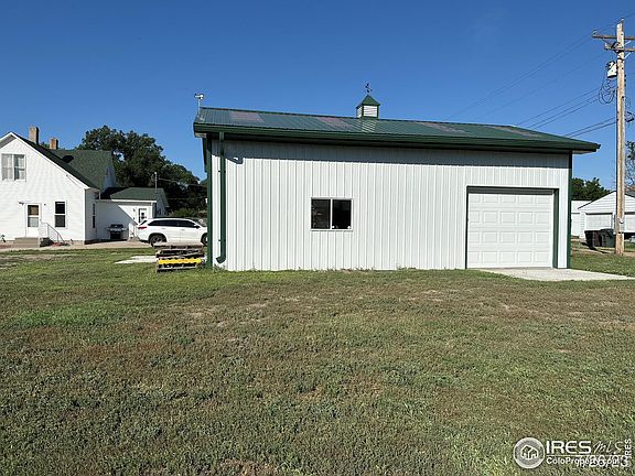 A Traditional style 1 1/2 story cross gable house on a 3/4+ acre lot near the center of Julesburg. The property features a new 840 sq. ft. steel garage/shop building and a 600 sf detached 2-car garage with a craft room/shop (incl separate entrance). The house has a 3/4 covered front porch with a gated balustrade. 2 bedrooms and an office space upstairs with a new 1/2 bath. The main level features a full custom kitchen done in a southwest tile with plumbed island, stainless steel appliances, custom lighting and a farmhouse sink. The living room and dining room have wood floors, original wood trim, tin ceiling tiles and wood pocket doors. The primary bedroom has wood floors and trim, plus an updated and refinished primary bath with walk-in shower, linen cabinet, antique vanity with marble top, and wood floor. Laundry room off the kitchen has plenty of storage space and a deep sink vanity.