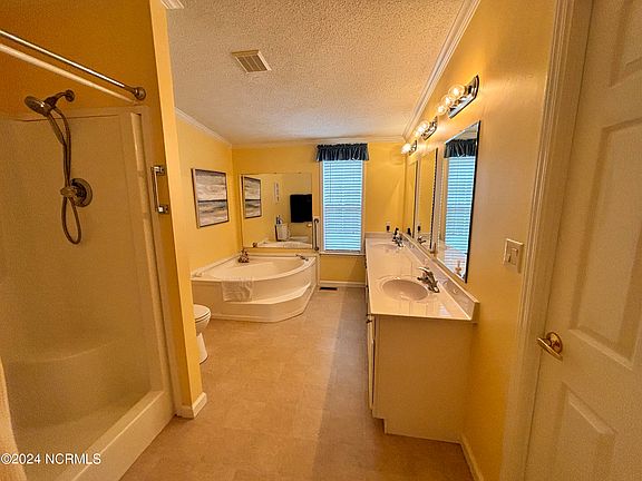 The open floor plan is bathed in natural light, thanks to large windows throughout the main living areas. A charming four-seasons room off the kitchen provides a seamless indoor-outdoor experience. The home features two bedrooms with spacious walk-in closets, including a luxurious first-floor primary suite complete with a garden tub, double vanity, shower, and generous walk-in closet.