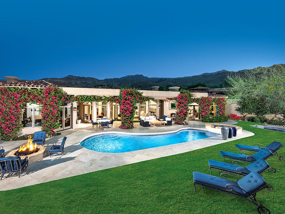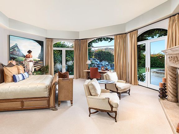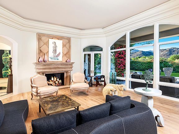 This Mediterranean-style residence is situated perfectly within BIGHORN Golf Club, and is walking distance to all member amenities. The main home includes three bedroom suites with private bathrooms and closets, as well as a handsome wood-paneled office with fireplace, library-style bookshelves, full bath and 'secret' closet. There is a chef's kitchen open to the family room and wet bar, and a dining room open to the living room. All spaces flow with one another, all space face out to a lovely outdoor living room with soft seating and fireplace. Contiguous vacant lot currently serves as flower garden with citrus grove. May be available as a separate purchase.
