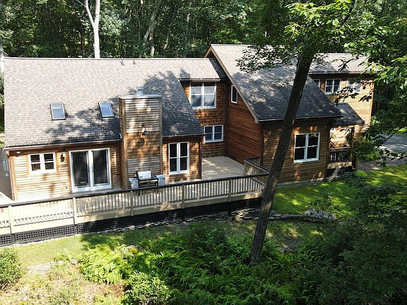 This property is amazing!! Surrounded by streams, Mountain Laurel and water views this 2.17 acres of wooded bliss has privacy and seclusion. Like having your own little private Island.!! As you enter this home you are greeted with the finest finishes of a Frank Lloyd Wright craftmanship. Brazilian wood flooring throughout, custom cherry railings, 3 propane fireplaces, all tile with built ins and stained glass finishes. Bedroom on main level with walk out sliders to deck. Gourmet kitchen with glass door pantry and all Jenn Air appliances and double gas stove. Center island with seating area surrounded by all soap stone countertops, cherry cabinets and vaulted ceilings with fireplace and custom lighting. Most amazing is eating at the table with the gorgeous built in fireplace while taking in the outdoor water views. Choose either of the beautiful cherry staircases that lead to 2 bedrooms, a water view primary suite, seating area and 2 beautiful Italian porcelain tile bathrooms that are welcoming . Jack and Jill bathroom boasts soaking tub with skylights for lots of brightness. Primary bedroom has propane fireplace, views of lake and large closet with hidden access to large walk along storage space. Large oversized two car garage with stained glass and walk out to carport to store boat or motorized toys. Large shed, large wrap around entertaining decks and much more! Must see to appreciate all this house has to offer!