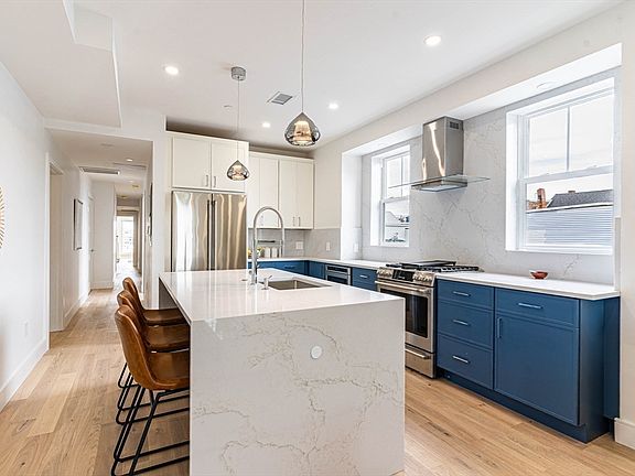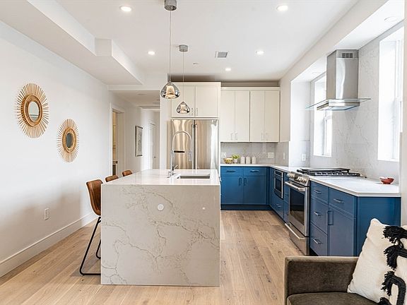 Owner's Special on this unit, BIG PRICE DROP! Beautiful brand new 8 unit condo complex in an A+ location in Jeffries Point! This building has it all - 1 covered parking spot with EV charging, elevator, fully equipped gym with Peloton + functional trainer etc, storage units, common roof deck with stunning views of the harbor + skyline, intercom, security cameras, professional HOA management company, heated bathroom floor, designer finishes. PH2 features a spacious living/dining/kitchen area, with an office nook, 3 bedrooms, 2 bathrooms, in-unit laundry and two private outdoor spaces. Absolutely STUNNING PRIVATE ROOF DECK and wet bar, as well as Porcelanosa engineered hardwood floors, Porcelanosa tile & vanities, Newport Brass plumbing fixtures plus custom closets in all 3 bedrooms, and a ~40sqft storage unit in the basement. Multi million dollar finishes in East Boston!! Renderings are subject to change, building is expecting move-ins to begin in Nov 2024.