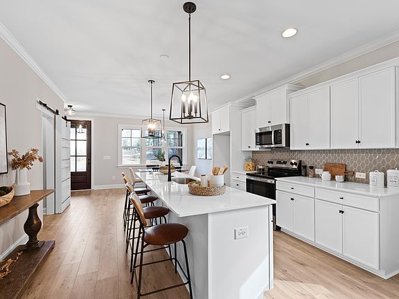 Welcome to your dream home, ''Custom Built by Ken Harvey Homes!'' This stunning residence boasts a huge rocking chair front porch, perfect for relaxing afternoons. Step inside to discover a main level study with a closet, ideal for a home office. Enjoy wide plank waterproof LVP floors and crown molding throughout the main living areas, providing a touch of elegance and durability. The kitchen is a chef's delight, featuring custom 'White Satin' painted cabinets with cove crown molding, 'Miami White' granite countertops, and a 2x4 'Dove' hexagon vertical tile backsplash. It also includes a double trash cabinet, single bowl stainless steel sink with a pull-out faucet, recessed lighting, a barn-door walk-in pantry, and stainless steel appliances. The main level primary suite is a true retreat, offering a ceiling fan with remote, crown molding, and a spacious walk-in closet. The primary bath features a 13x13 'Glacier White' diagonal lay tile floor, a dual vanity with 'Niagra' quartz countertops, and a 12x24 'Glacier' vertical lay tile surround walk-in shower with a niche. The family room, perfect for gatherings, includes a black slate surround Marquis gas log fireplace with a Wescott mantle and a ceiling fan. French doors lead to a covered porch, ideal for outdoor entertainment. Upstairs, you'll find an additional bedroom, a large game room, and convenient walk-in storage.
