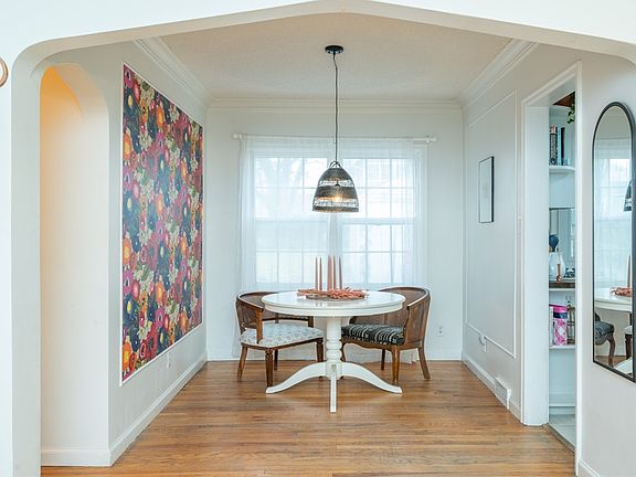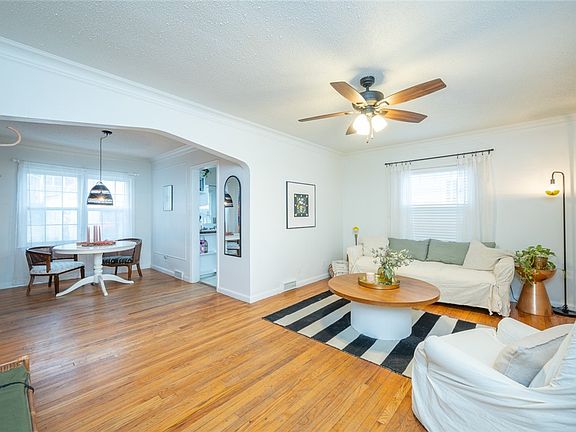 Colonial style story and a half with real wood floors on both floors. Large living room that opens to formal dining room, two full updated baths, one on main floor, the other separating two good size bedrooms upstairs. Kitchen has updated countertops, tiled backsplash, and access to fenced yard. Home is located on quiet street and close to interstate access.