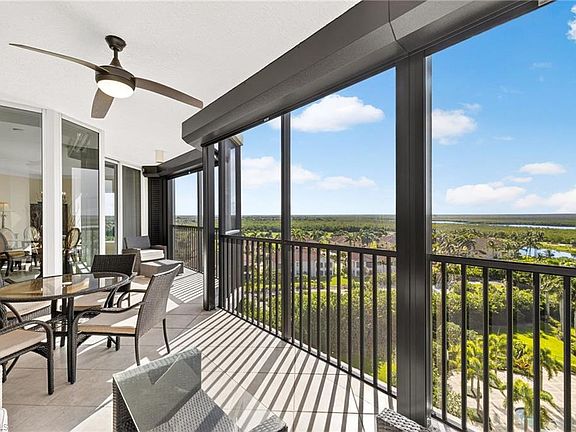ONE OF THE LOWEST PRICED UNITS IN THE BUILDING—ideal for downsizing or as a seasonal escape. Welcome to this TURNKEY-furnished 2BR + Den, 2.5BA condo on the 7th floor with panoramic views of McIlvane Bay & the Marco Island skyline. A private elevator opens to a grand foyer leading to an open-concept living area with full-height impact sliding doors, expansive screened lanai, and a spacious kitchen that has been optimized to feature the amazing views and also features STAINLESS STEEL KitchenAid appliances. Recent upgrades include HUNTER DOUGLAS MOTORIZED BLINDS, AUTOMATIC ROLL DOWN SHUTTERS & FRESH INTERIOR PAINT. The flexible DEN with French doors & ONE-WAY WINDOW functions perfectly as a private office or guest room. Those amazing views continue into the spacious primary suite featuring a HUGE walk-in closet, additional closet space, dual vanities, soaking tub & shower. The guest suite offers its own walk-in closet, ensuite bath & enough space for 2 queen beds. There are TWO deeded parking spaces, one near the lobby. Aversana at Hammock Bay offers resort-style amenities: pool & spa, sauna, fitness center, theater, billiards, grilling area, guest suites & monthly events. Gated, non-mandatory golf community minutes to Marco Island beaches & 1.5 miles to Marco Island Executive Airport. Schedule your private showing today!
