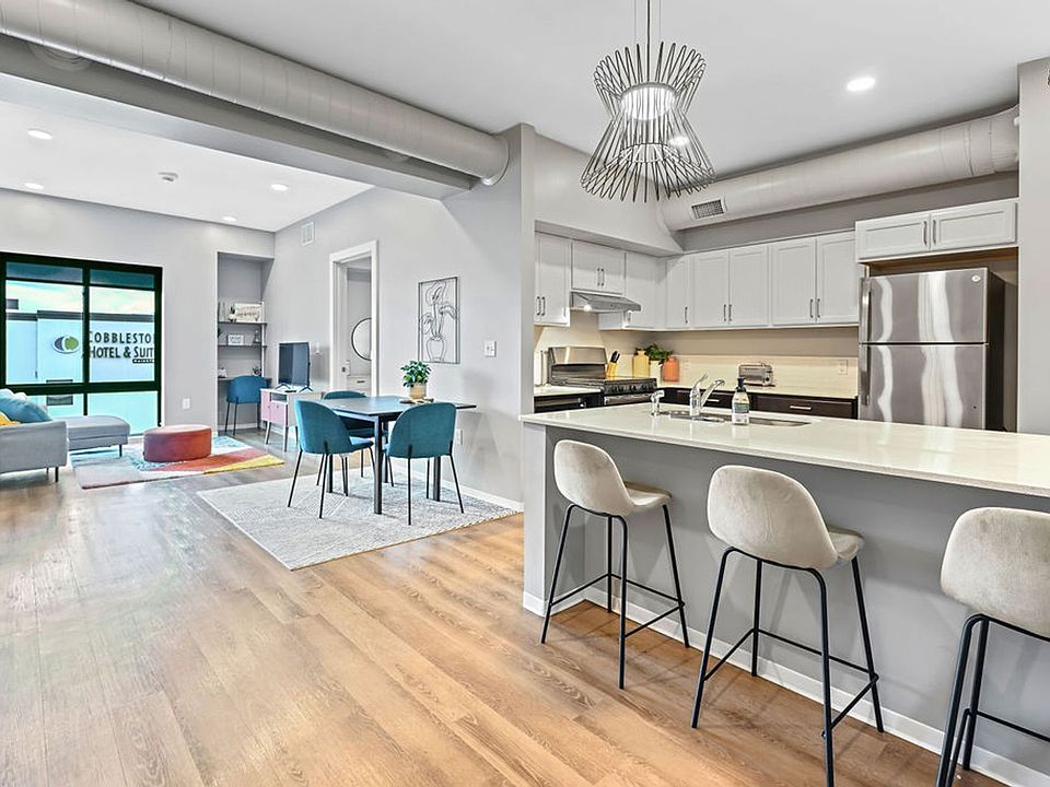 • Exterior features: 9 Foot Ceilings, Balcony, Bicycle storage, Building Common Room, Convenient Downtown Location, Lobby, Murphy Bed + Sofa Combo, Online Payment, Parking Available, Quartz Countertops, Rolling Window Shades, Stainless Steel Appliances, Stand Up Shower, Tub/Shower Combo, Type A Accessible Unit, Wardrobe
