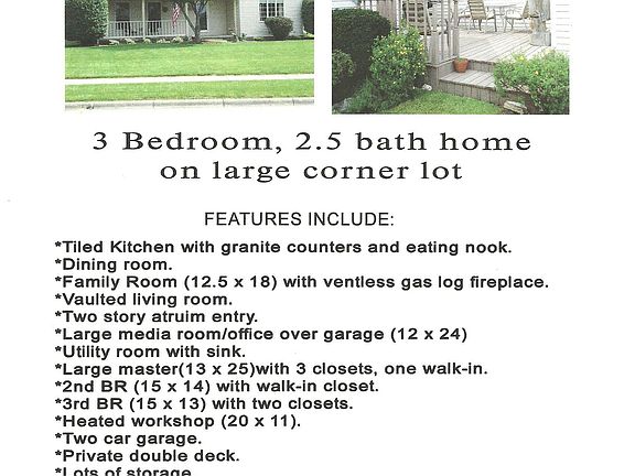 Spacious 2700 sq ft 3 bedroom, 2.5 bath home in Storybrook Subdivision on large corner lot. Dining room, private deck, bonus room, kitchen w/granite countertops and workshop. Neighborhood Description Nice mix of one and two story homes with sidewalks and evening lighting.