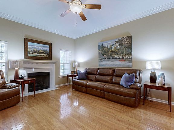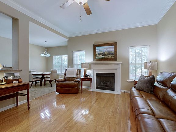 All Bedrooms on Main Level with large Bonus Room over the Garage featuring a tremendous walk in Attic Storage. Freshly painted throughout. Hardwood floors in Family Room and Foyer that surround your Gas Fireplace. Soaring Ceilings surround this open floor plan that flows between the Living Room and Kitchen for entertaining fun. Dual sinks with separate soaking tub and walk-in shower in your Primary bathroom make for early morning prep for the day so smooth. Plus a large walk-in closet. Also included is a huge level floored Attic with a full size door for access. Outside you will enjoy your patio surrounded by the fence and treed line at the rear of the property. There is a walking trail throughout the community. Includes a riding lawn mower.