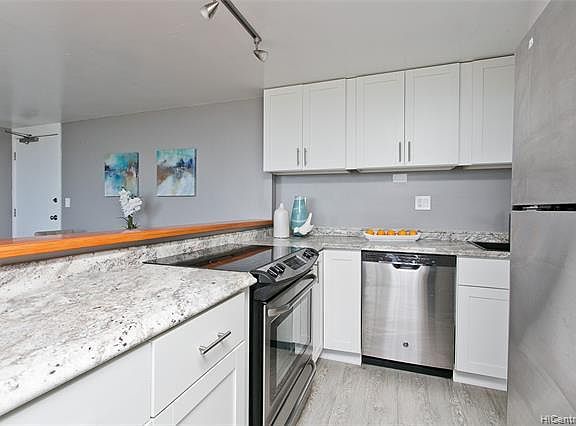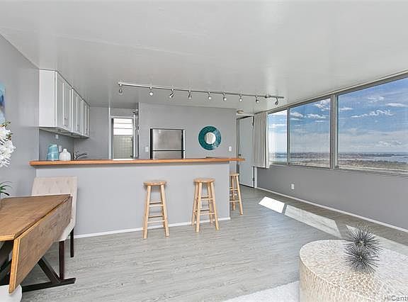 Spectacular 180° Diamond Head to Ewa Beach ocean views from this executive style unit. Low Maintenance fees! Fully renovated in 2017, new kitchen, paint, vinyl plank flooring, new stainless range and dishwasher, new bathroom sink, shower enamel and popcorn ceiling was removed. Building has sprinkler system for safety. Amazing wood bar top was hand made from solid wood bleacher benches from Kam schools. Comes with one covered parking stall close to elevators in secure parking lot. 24 hour building security, pool, hot tub, basketball/tennis court and guest parking.