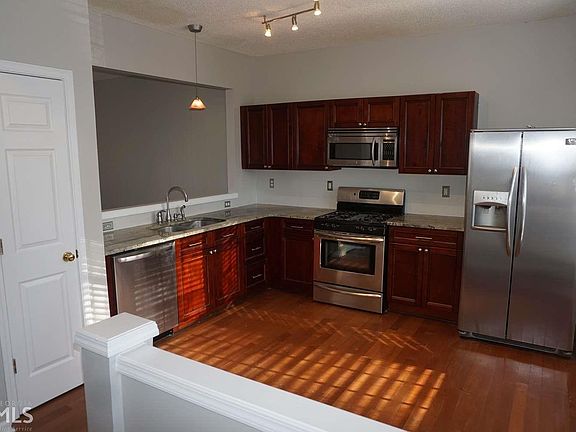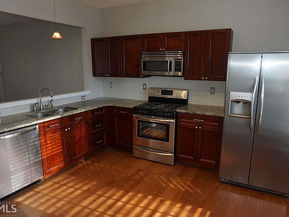 Open plan with upgraded kitchen including newer cabinets, granite counters, stainless steel appliances, and hardwood floor. Large living room with gas starter fireplace and dual sliding doors to patio. Half bath on main level. Two huge bedrooms upstairs each with vaulted ceiling and private bathroom. Back bedroom includes hardwood floor. Master bath has double vanity and garden tub. Upstairs laundry with washer & dryer included. Well maintained complex. Great location with close proximity to downtown Alpharetta.