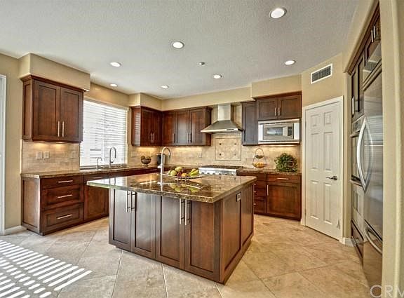 Located in the private Alta Vista South neighborhood, this home is just minutes from the Alta Vista Country Club. The opportunities are endless when you combine an exceptional location in Placentia, an outstanding open floor plan, and an absolutely beautiful interior. Guests are greeted with a stacked stone entryway that leads into the living room and formal dining room. Both rooms feature sky-high ceilings, travertine floors, crown moldings, an abundance of natural light, and sleek wall cut-outs. The recently remodeled kitchen has custom maple cabinetry, granite countertops, tumbled travertine floors, high-end built-in stainless steel appliances and it opens up to the family room. The family room has a cozy stacked stone fireplace and recessed lighting throughout. Upstairs you will find the beautiful master bedroom with a huge master bathroom. The updated master bath has dual vanities, a jacuzzi tub, and a luxurious shower. Upstairs you will find ample storage space, an individual laundry room, and spacious bedrooms. This home also features a lovely entertainers backyard with a large BBQ island and a shaded patio. Some additional features include: dual zone ac/heating units, surround sound audio system, water softener, and epoxy garage floor.
