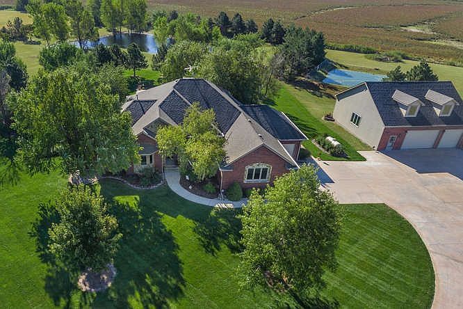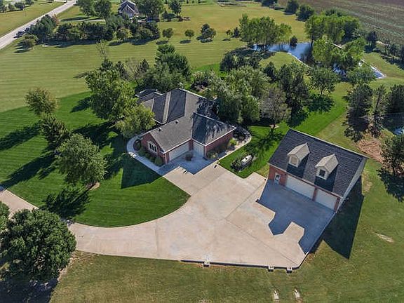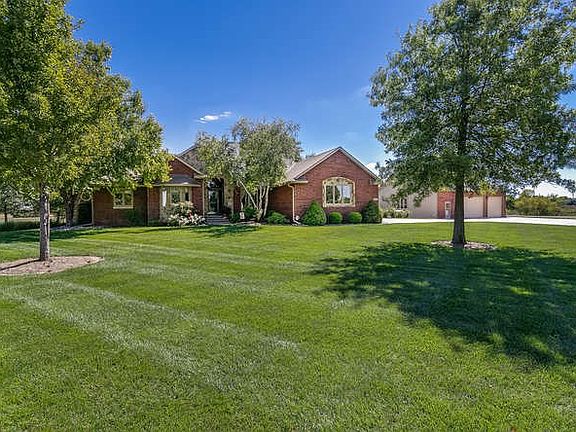 Incredible, one-owner, all brick, custom built home on 5.03 acres with over 100 trees, private lake, and gorgeous setting! Property includes 18' x 42', 9 ' deep salt water pool with heater, auto cover, auto cleaner, and diving board. Beautifully landscaped with waterfall feature by pool. Adjacent pool house features awesome covered outdoor bar/kitchen with stainless cabinets, built-in bar stools and outdoor TV cabinet - and inside the pool house offers a kitchenette, full bath and changing area. 30' x 40' outbuilding includes 9' garage doors, extra lighting, indoor basketball goal and a 26' x 9' heated and cooled area with a dedicated entrance perfect for workout room, home office, etc. Completing the amazing outdoor living space in this home is a large, screened in Trex deck overlooking the pool and waterfall. Inside, this home has been beautifully updated with tasteful decor and custom window treatments. Great floorplan with large hearth room open to kitchen. The well appointed kitchen includes travertine tile floor and backsplash, granite, updated cabinetry, eating space, eating bar, double ovens, warming drawer, SubZero refrigerator, and Wolf cooktop. The master bath was recently updated and is stunning! This home includes 5 total bedrooms plus a dedicated office, which could be used as a 6th bedroom. 5 total baths, all updated with granite (except bath in pool house). Finished walk out basement holds large family/rec room, wet bar, fireplace, full bath and two large bedrooms. Other notable features of this home are brand new geo-thermal HVAC unit, two irrigation wells (one for home, one for yard), sprinkler system with drip system for beds, manicured fescue grass surrounding home (buffalo grass on rest of acreage), Class IV composite roof, commercial grade guttering with covers, invisible fence, large capacity R/O system, water heater and water softener replaced within last five years. If you're looking for the perfect suburban property with AMAZING interior updating and SPECTACULAR outdoor living space, you will love this home! This home has so much to offer, AND it is located in the highly acclaimed St. Marks school district -- in September, 2016 named the best elementary school in Kansas by StartClass! And bus pick up right at the end of the driveway!