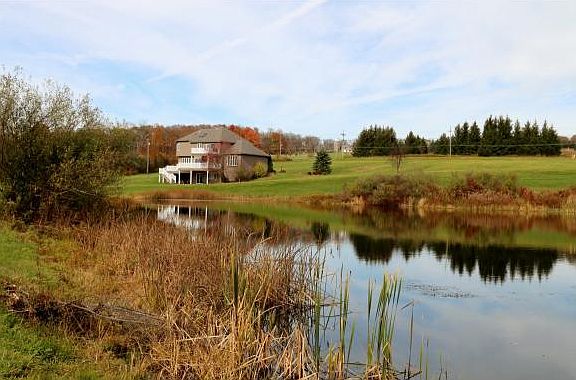 Striking custom contemporary overlooking 22 acres w stocked pond yet minutes to every city amenity. Relax on the multi-level decking with panoramic views. Detached oversized 1500 sq foot loft garage, workshop and storage. Walk out LL entertainment room with wet bar. Freshly painted kitchen and baths. All the features you'd expect and more!