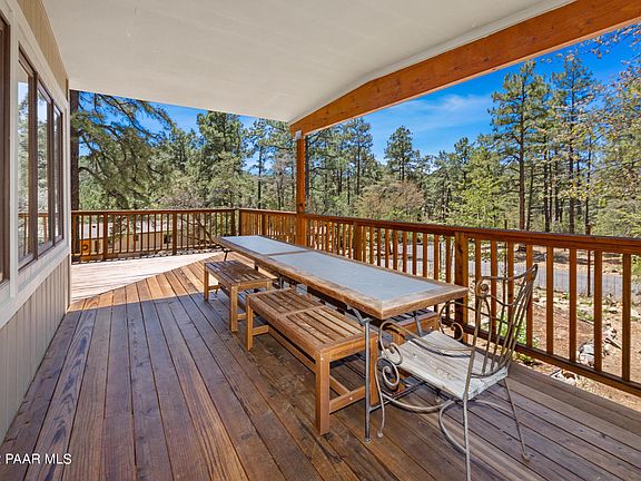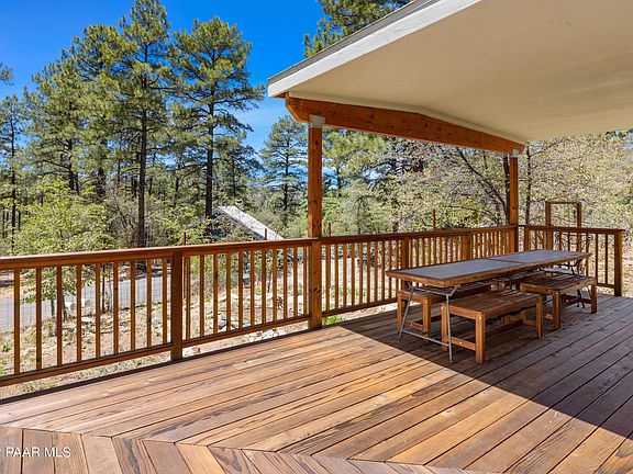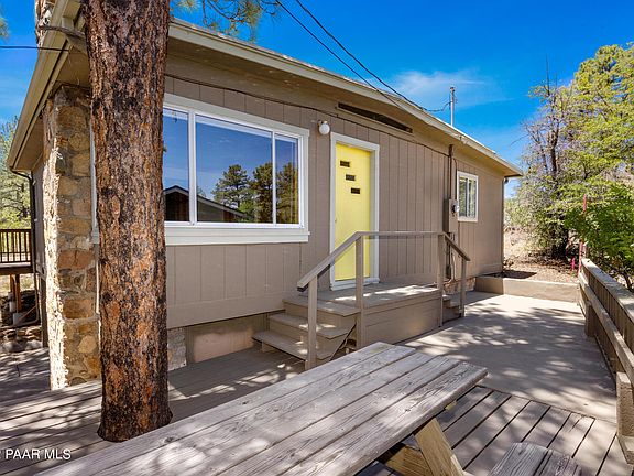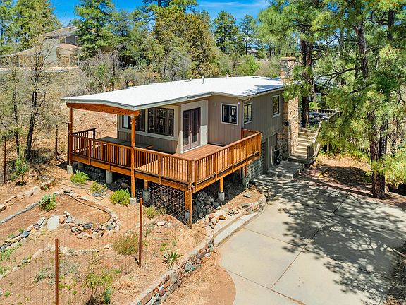 Mountain Club hilltop perch - share peaceful sunrise and sunset views with blue jays, ravens, deer and javelina.Covered redwood deck overlooks heart-shaped garden (gopher-, deer- and javelina-proofed).Extensive use of native Arizona stone inside and out including wood-burning fireplace.Slate and hardwood floors throughout.Two driveways with ample parking, rare in Mountain Club.Garage with laundry room and plenty of storage.Separate finished studio with wood floors, windows and electricity.Minutes to downtown, Goldwater lake and national forest trail systems