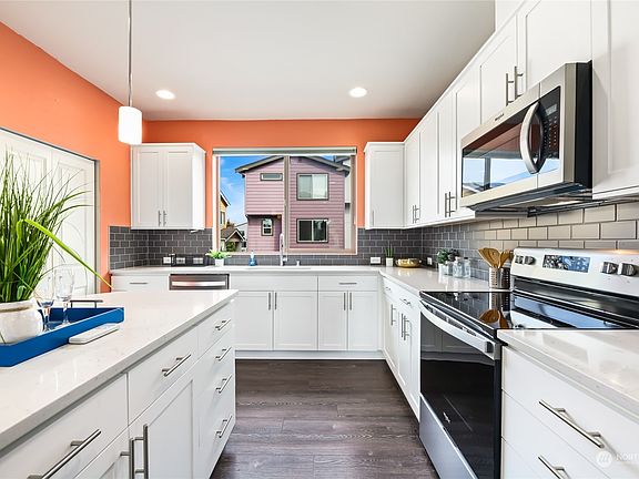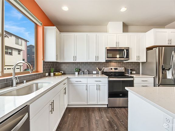 Welcome to a gorgeous contemporary townhome built in 2021 in the vibrant Greenbridge Community, featuring a Great Room concept with a gourmet kitchen, quartz counter tops, art deco backsplash & soft-close cabinets & drawers plus pantry. You’ll appreciate the large primary suite with walk-in closet, 2nd bedroom with a Murphy Bed & ensuite bathroom, mini-split heat pump for A/C, laundry & linen closet conveniently located on the upper level, attached 2 car garage with storage space, a private covered deck off the family room and even plenty of front yard space and grass for your pets. HOA Dues cover landscaping, roof, siding & windows. Easy access to 509 gets you to Downtown Seattle quickly and walk with shops & restaurants.