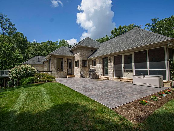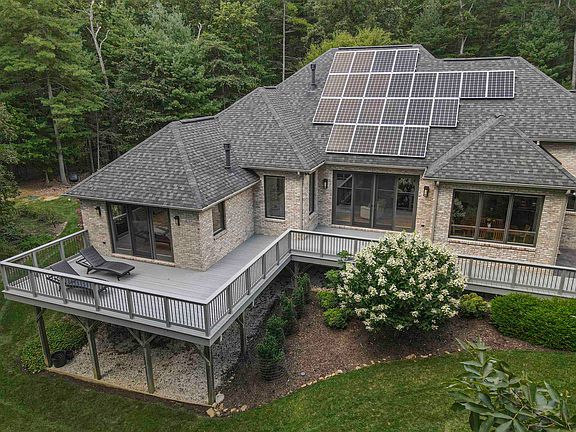 One-of-a-kind custom brick home nestled on 5 acres. Energy features: Geothermal HVAC with humidifier, solar panels, whole-house gas generator. Unique interior features:10ft ceilings, library w/ floor-to-ceiling natural cherry shelving, 2 rolling ladders, built-in “post office”, central lighting system for kitchen & living room, solid walnut flooring. Kitchen boasts black granite counters, high end appliances include wall convection oven, microwave & warming drawer, French door refrigerator, quiet dishwasher, prep sink & large sink in the island. Butler pantry has solid cherry cabinets, wine cooler & fridge. Primary suite: Walk in closet, solid maple shelves, 2-person steam shower w/ long bench & niche, heated tile floors & private deck; guests can luxuriate in a bubble tub in guest bath. Southern exposure provides abundant light. Relax outdoors in screened porch, expansive deck & patio, natural gas grill hook-up, raised rock-walled garden, irrigation system, professional landscaping.