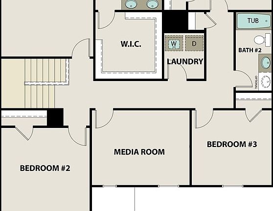 Our two-story Barrington located in Tranquil South features 5 Bedrooms/3 Bathrooms and many options for a large family or someone that likes to entertain. Walking in through the foyer there is a flex room that can also be converted into a 5th bedroom. Continuing down the corridor you are greeted by the family room open to the dining room and large kitchen equipped with stunning cabinetry, modern cabinet hardware, and a breakfast bar. Upstairs has a large primary suite with a big primary bath, walk-in closet, and separate shower. A full bath is also shared between the other 3 bedrooms, a laundry area, and a two-story foyer. There is a media room perfect for family movie nights or it can be turned into another bedroom for guests. Artistic rendering(s) are for informational purposes only. Artistic renderings are for informational purposes only. Actual floor plans, features, and inclusions may vary.
