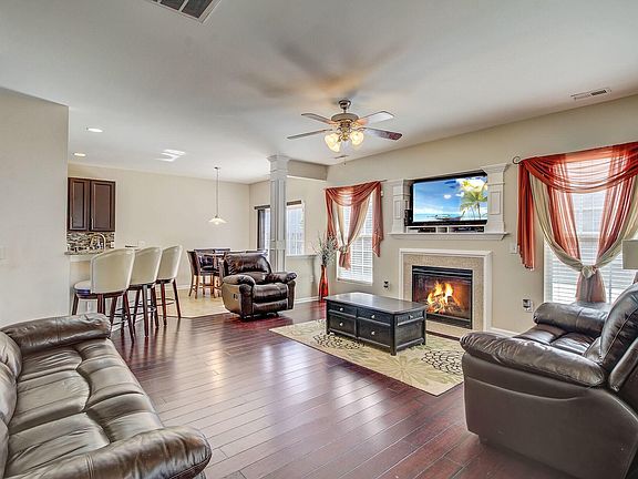Welcome Home to this fabulous 4 bedroom home in superb conditon!! This home has so many great upgrades including but not limited to a tall open ceiling in the entry foyer, wide hardwood floors downstairs, newly installed granite counter tops in the kitchen, DOUBLE oven, built in microwave with air fryer, recessed can lights, stainless steel appliances and a food showcase fridge. Home also features an open floor plan layout with an eat in kitchen and separate dining making this home ideal for family living and entertaining. Master bedroom has vaulted ceilings, a deluxe master bathroom and a walk in closet. Large fenced in yard with new deck to enjoy BBQs and outdoors with friends and family. Home is located in DD2 school district and neighborhood amenities include community pool and pavilio