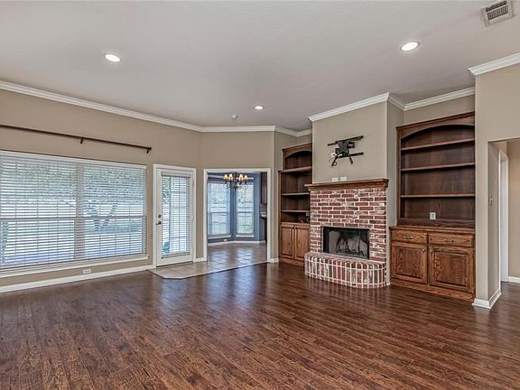 Popular Lakeland Meadows. Well maintained 4 bedroom/2 bathroom. Formal Living Room has raised ceiling, brick fireplace, built-in cabinets, and wood flooring. Kitchen has granite counters, tile flooring and a breakfast area. Isolated master bedroom features a trayed ceiling and wood flooring. Master bath with tiled shower, garden tub, dual vanities and separate closets. Large, fenced backyard. Extended hand stamped concrete patio, well landscaped and several nice live oak trees. New roof in 2018. Refrigerator and safe do not convey.