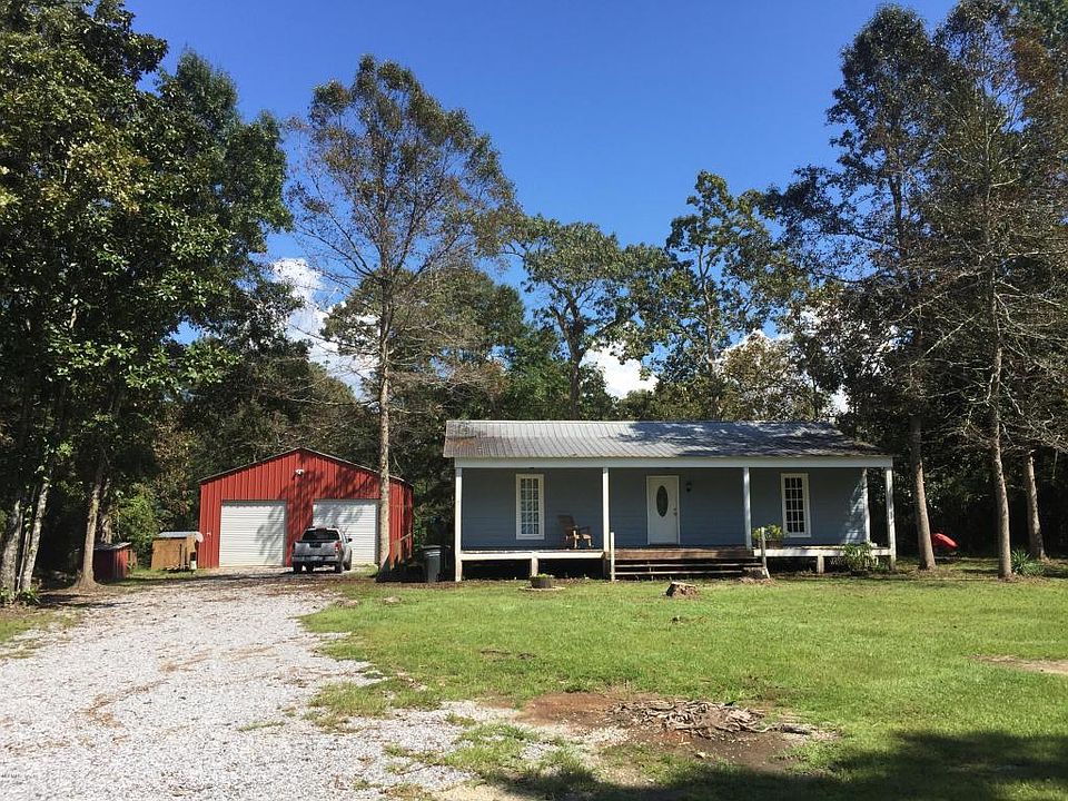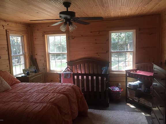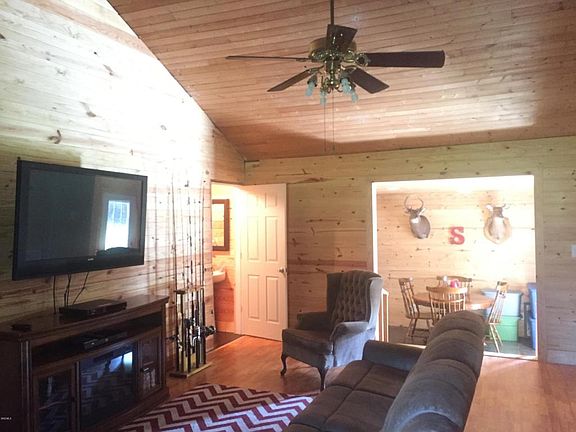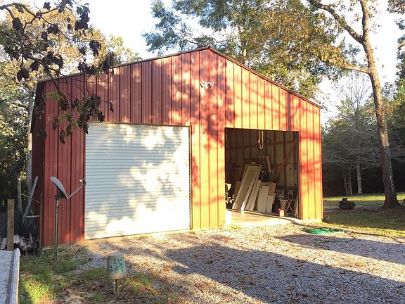 Very private wooded setting. Interior is rustic style with wood walls and ceiling. Split floor plan with master suite to the rear of house. High ceilings. Walk-in closets. Wide front porch runs entire width of house. Rear porch deck overlooks natural wooded landscape and measures 16 x 24 ft. Metal shop building is 30 x 40 ft. House needs a little work to the interior but still a bargain at $124,000.