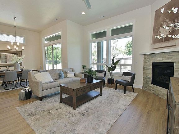 The Donnelly 3.2 plan. This brand new single story design by Emmett Price Homes has an elegant front exterior w/hip roof design. The home is of a popular split bedroom plan and comes with quartz counters, SS kitchen appliances, Bosch double oven, microwave, kitchen island dishwasher, 5 burner cooktop & walk-in pantry. VCC waterproof flooring for easy maintenance, 11'6" ceilings in the great room & dining area. Included is a gas fireplace, covered patio, private owner's suite with large walk-in closet, dual vanities, walk-in shower and oversized 2 car garage - 27'X21' & 18'X8' garage door. Partially fenced yard & full sprinklers and full landscaping! This home is located in a planned community with community pools, recreation center, pickle ball courts, gym, tot lot, basketball court and miles of paths. All the homes are a short distance to lakes and the Boise River Walk. HOA Dues includes fiber optic internet, and pressurized irrigation.