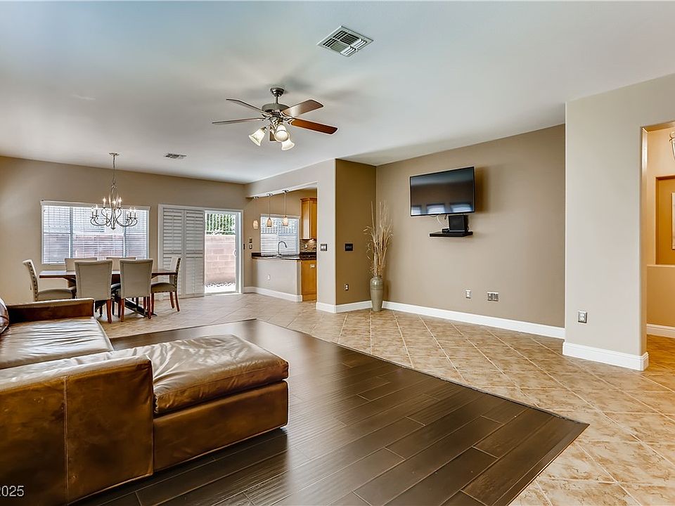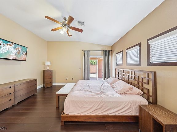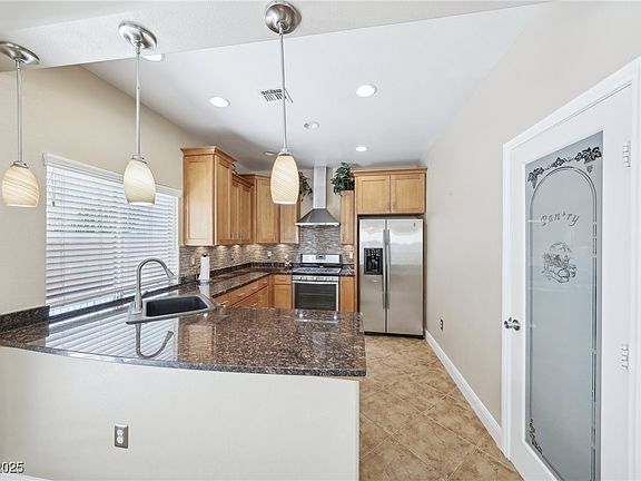 Charming single-story home in a Summerlin Gated community near shopping, Costco, trails & DTS.This residence features an open-concept layout with high ceilings & abundant natural light creating a warm and inviting atmosphere throughout.The modern kitchen boasts granite countertops,breakfast bar,modern backsplash,stainless steel appliances,range hood,recess & designer lighting & a large pantry all flowing effortlessly into the dining & living areas.Step outside to a low maintenance private backyard with two separate entrances & a covered patio, perfect for entertaining or unwinding.Spacious master bedroom has a separate tub & shower & a walk in closet.The secondary bedrooms are generously sized & versatile-perfect for guests,home office or kids rooms, each offer closet space.Laminate and tile flooring throughout. Two tone paint, epoxy finished garage with lots of storage cabinets, water softener & an electrical car charger.Enjoy a great gated living in a well-kept walkable neighborhood.